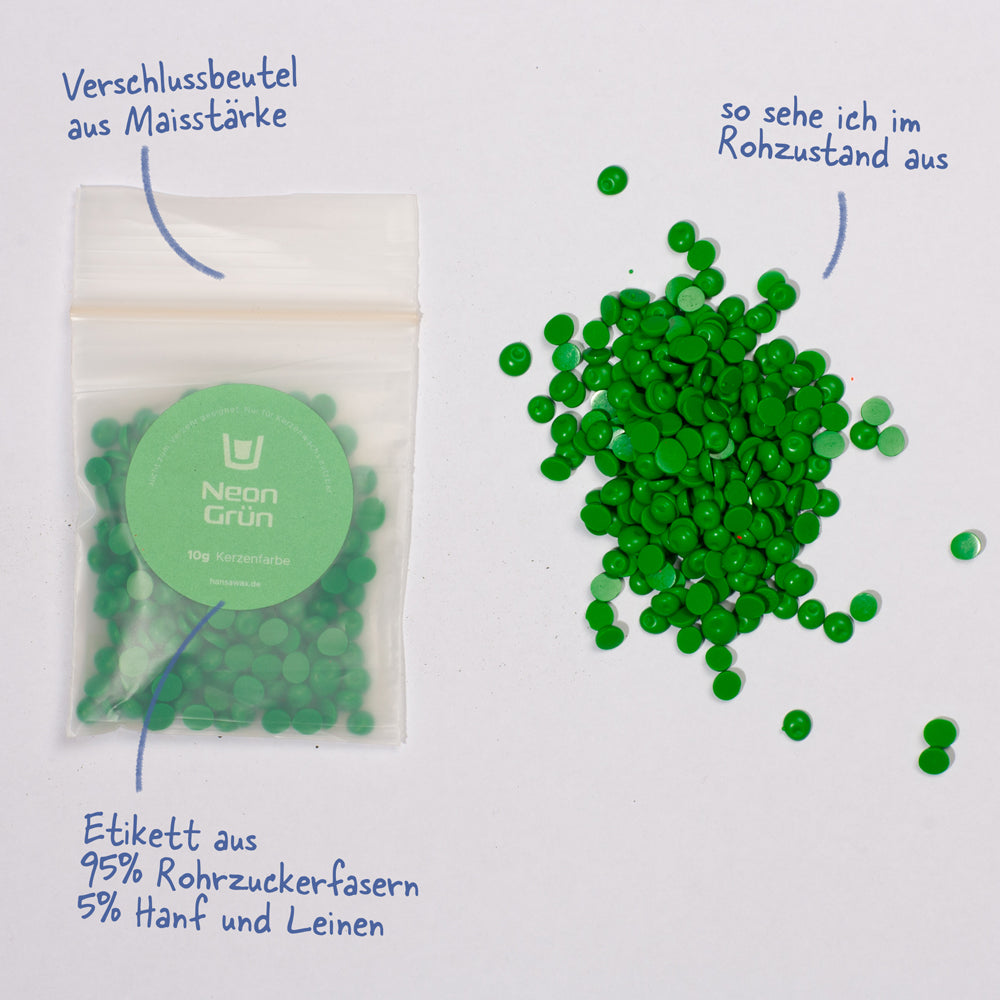 Our colors are produced in Germany and consist of a mixture of color pigments and dyes, which create brilliant colors and strong tones in your candles without having too much of an impact on the burning behavior of your candle. The candle colors can be used for any natural wax (rapeseed wax, soy wax and sunflower wax, sometimes also beeswax), but also paraffin, stearin and palm wax mixtures, and come in practical, resealable bags made from corn starch that do not harm the environment.
