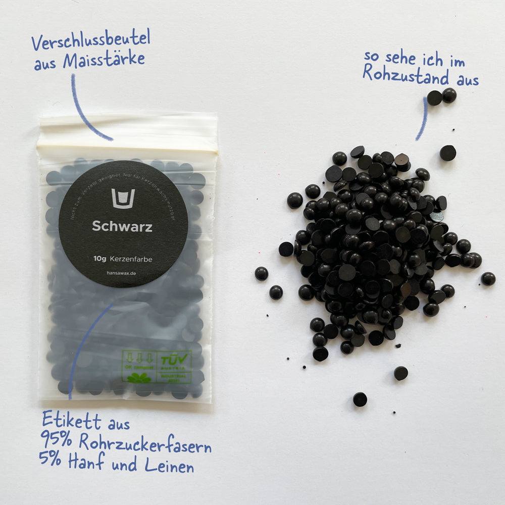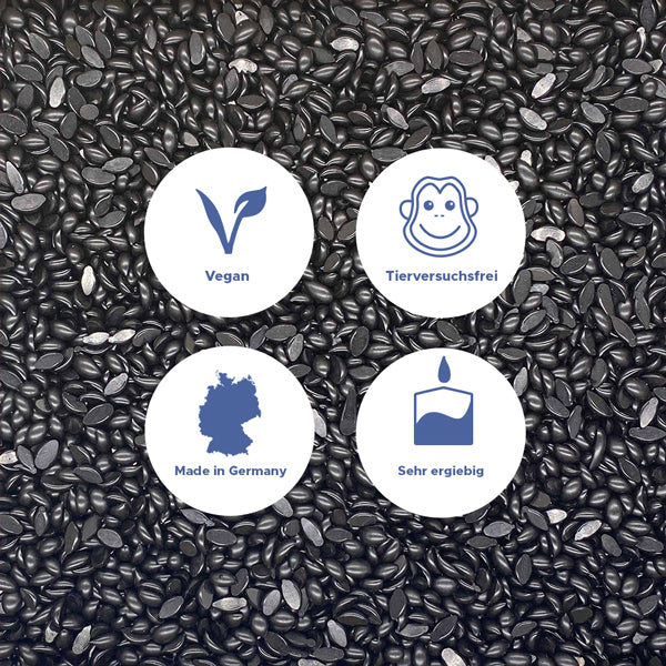 Our colors are produced in Germany and consist of a mixture of color pigments and dyes, which create brilliant colors and strong tones in your candles without having too much of an impact on the burning behavior of your candle. The candle colors can be used for any natural wax (rapeseed wax, soy wax and sunflower wax, sometimes also beeswax), but also paraffin, stearin and palm wax mixtures, and come in practical, resealable bags made from corn starch that do not harm the environment.
