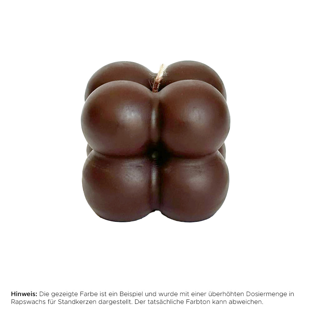 Für "Braun" wird eine Zugabe von 0,01g (0,001%) für eine niedrige-, 0,015g (0,015%) für eine mittelere- und 0,2g (0,02%) für eine hohe Farbintensität auf 1000g Kerzenwachs empfohlen.