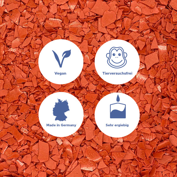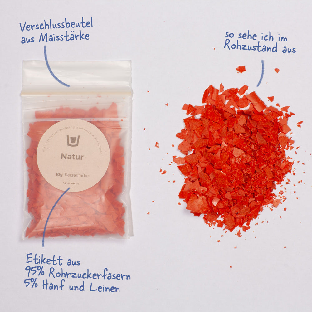Unsere Farben werden in Deutschland produziert und bestehen aus einer Mischung von Farbpigmenten und Farbstoffen, welche brillante Farben und Kräftige Töne in deinen Kerzen erzeugen, ohne das Brennverhalten deiner Kerze zu stark zu beeinflussen. Die Kerzenfarben können für jegliche Naturwachse (Rapswachs, Sojawachs und Sonnenblumenwachs, bedingt auch Bienenwachs), aber auch Paraffin-, Stearin und Palmwachsmischungen, angewendet werden und kommen in praktischen, wiederverschliessbaren Tüten aus Maisstärke daher, die die Umwelt nicht belasten.