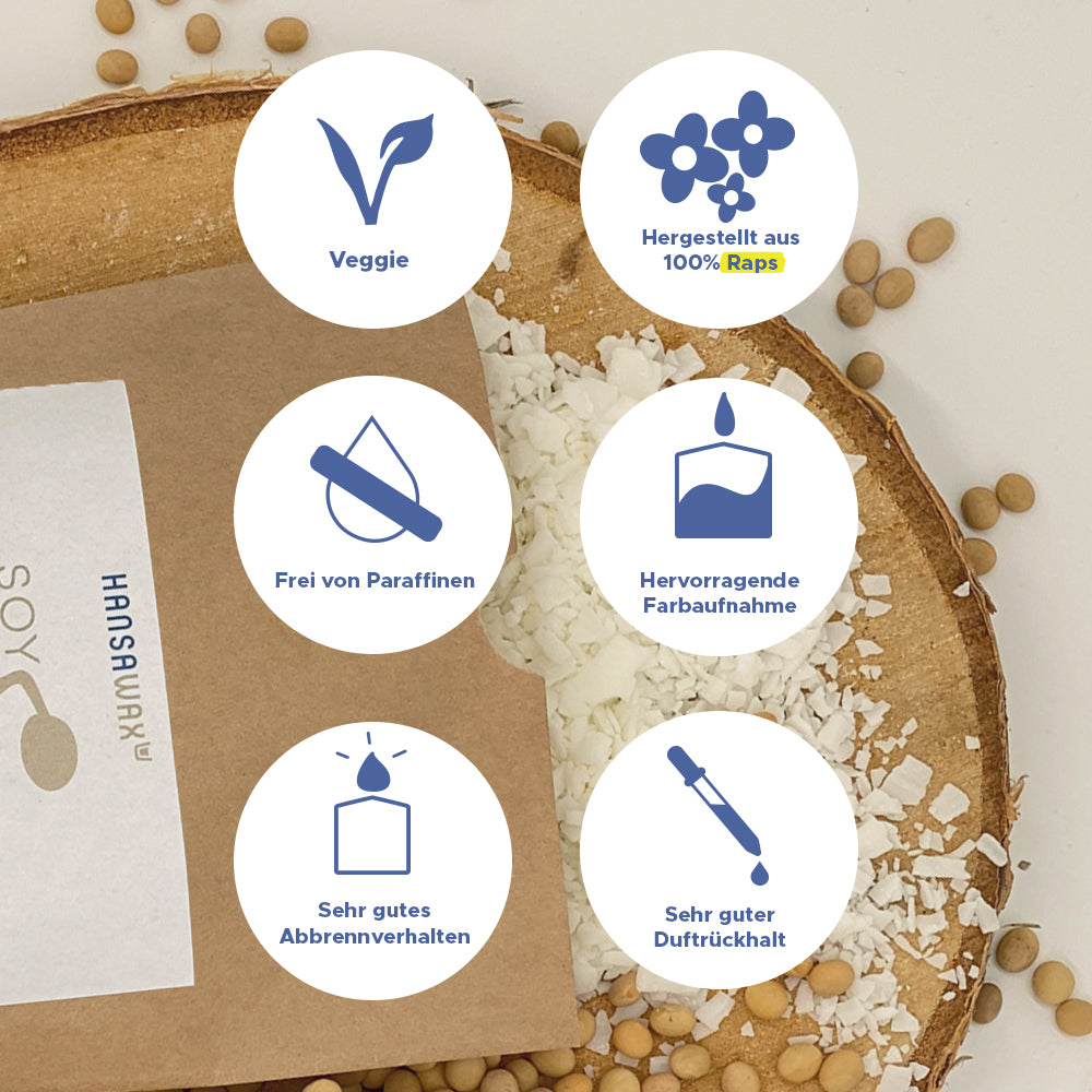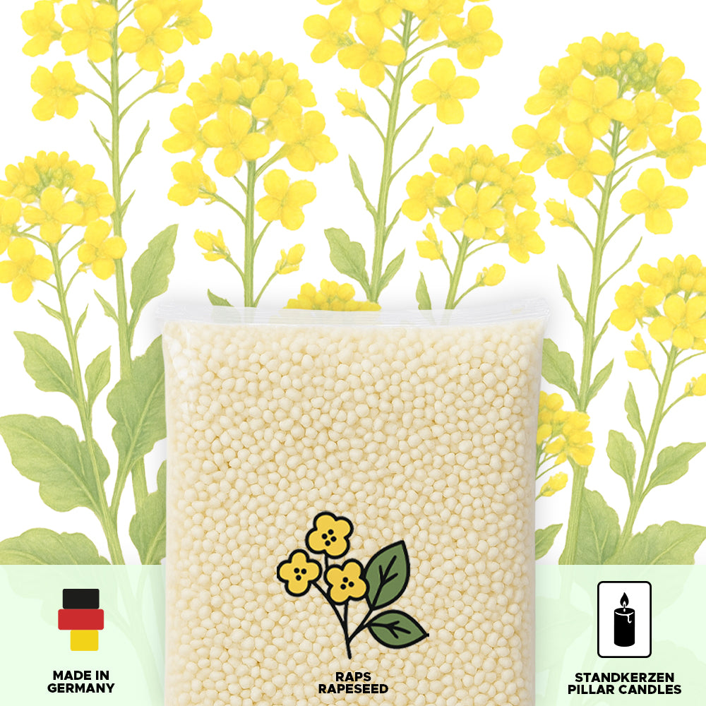 Unser Rapswachs besteht aus natürlichem, gehärtetem Rapsöl. Rapswachs ist ein hervorragender Trägerstoff für Duftöle, da es sich durch ein besonders gutes Rückhaltevermögen von Duftstoffen auszeichnet. Gerade beim Abbrand entfaltet es sein volles Aroma. Rapswachs eignet sich also besonders gut für das Kerzengießen von Standkerzen bzw. Stumpenkerzen. Außerdem brennt es rückstandsfrei und hinterlässt eine saubere Raumluft. Die Rapswachs Pastillen eignen sich hervorragend für das Gießen von Standkerzen, Skulpturen und Duftmelts und sind vollständig mit unserem Angebot an Kerzenfarbe und Duftöl kompatibel.