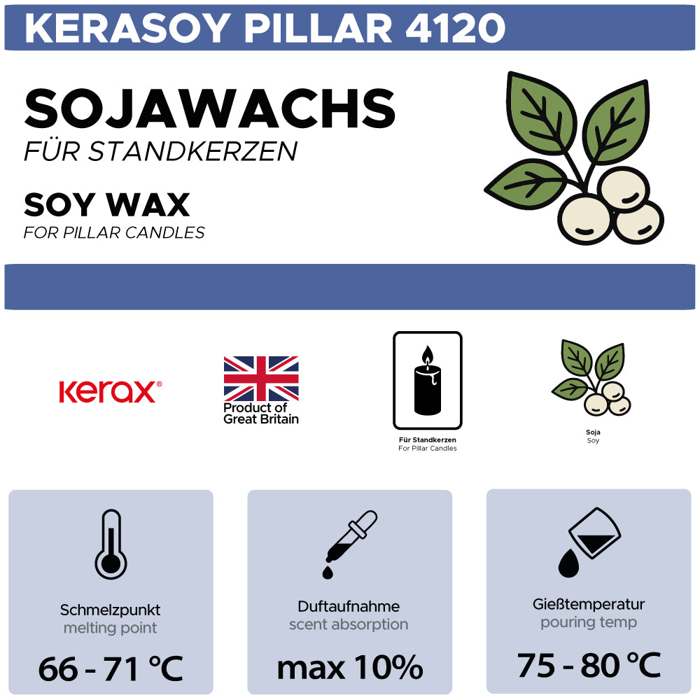 Sojawachs "KeraSoy Pillar 4120" wurde speziell für die Herstellung von Standkerzen bzw. Stumpenkerzen entwickelt und besteht aus in Europa kultivierten Sojabohnen - es ist daher besonders nachhaltig. Der bewusste Verzicht von Paraffin und tierischen Produkten stand bei der Entwicklung im Vordergrund. Es ist daher vegan und frei von Tierversuchen. Das Sojawachs eignet sich hervorragend für das Mischen mit Duftölen und Kerzenfarben. Das ganz Besondere dabei ist, dass aufgrund der speziellen Mischung meist nur ein Gießvorgang nötig ist, um eine Glatte Kerzenoberfläche zu erreichen. Dieses Sojawachs ist geeignet für Standkerzen/Motivkerzen, Stumpenkerzen, Skulpturen aus Silikonformen, Sachets und Duftmelts.